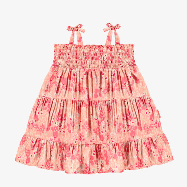Pink dress cut to fit at the top and flared at the bottom with an all over print of delicate pink, yellow and white flowers. Honeycomb-effect top and gathers at waist and bottom. Straps are adjustable. Made in viscose, a light, fluid fabric perfect for the summer season.