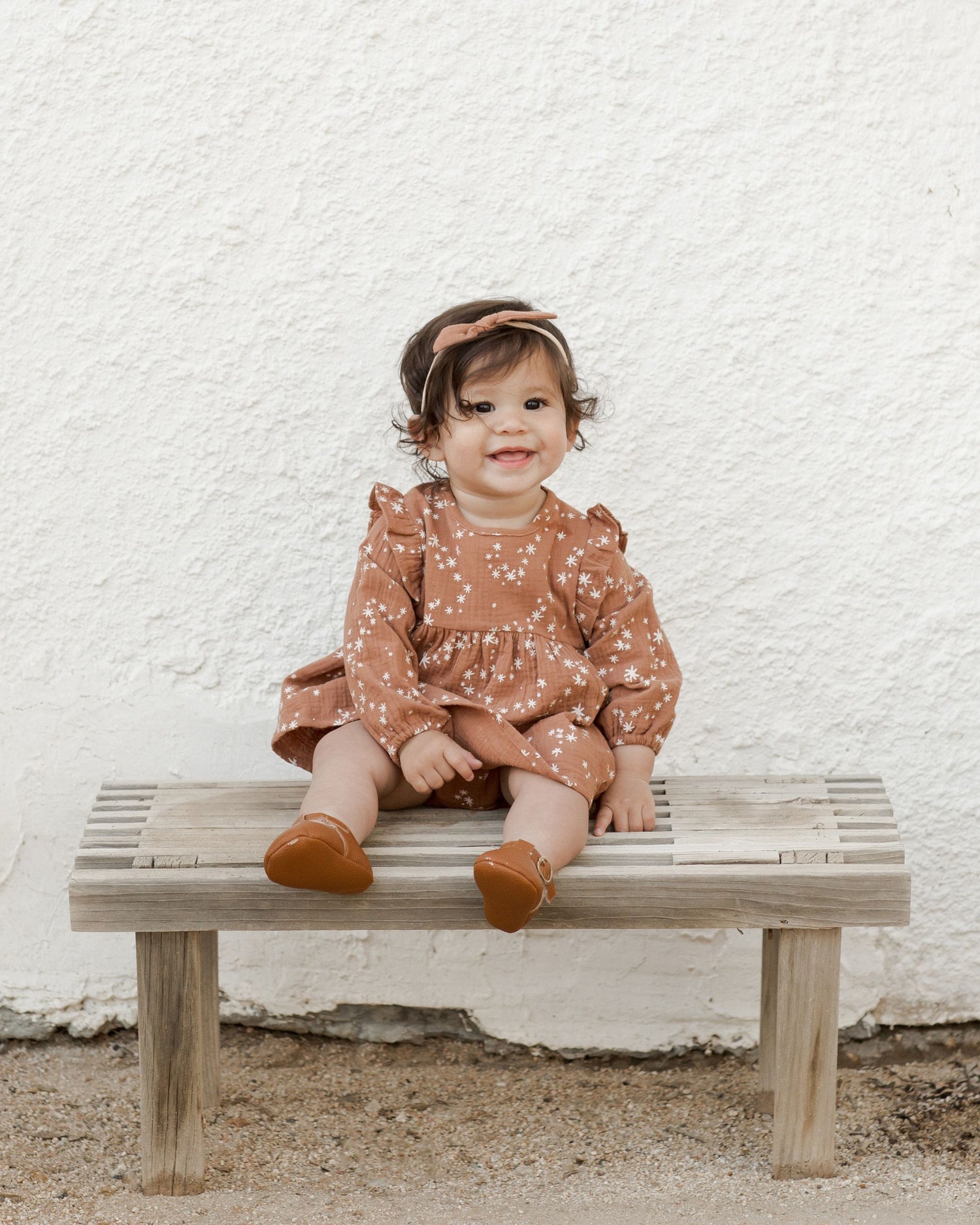 Piper Set featuring an all-over print. Ruffle trim sleeves and back button closure. Empire waist with gathers creates a sweet babydoll hem. Our ruffled bloomers to complete the outfit!