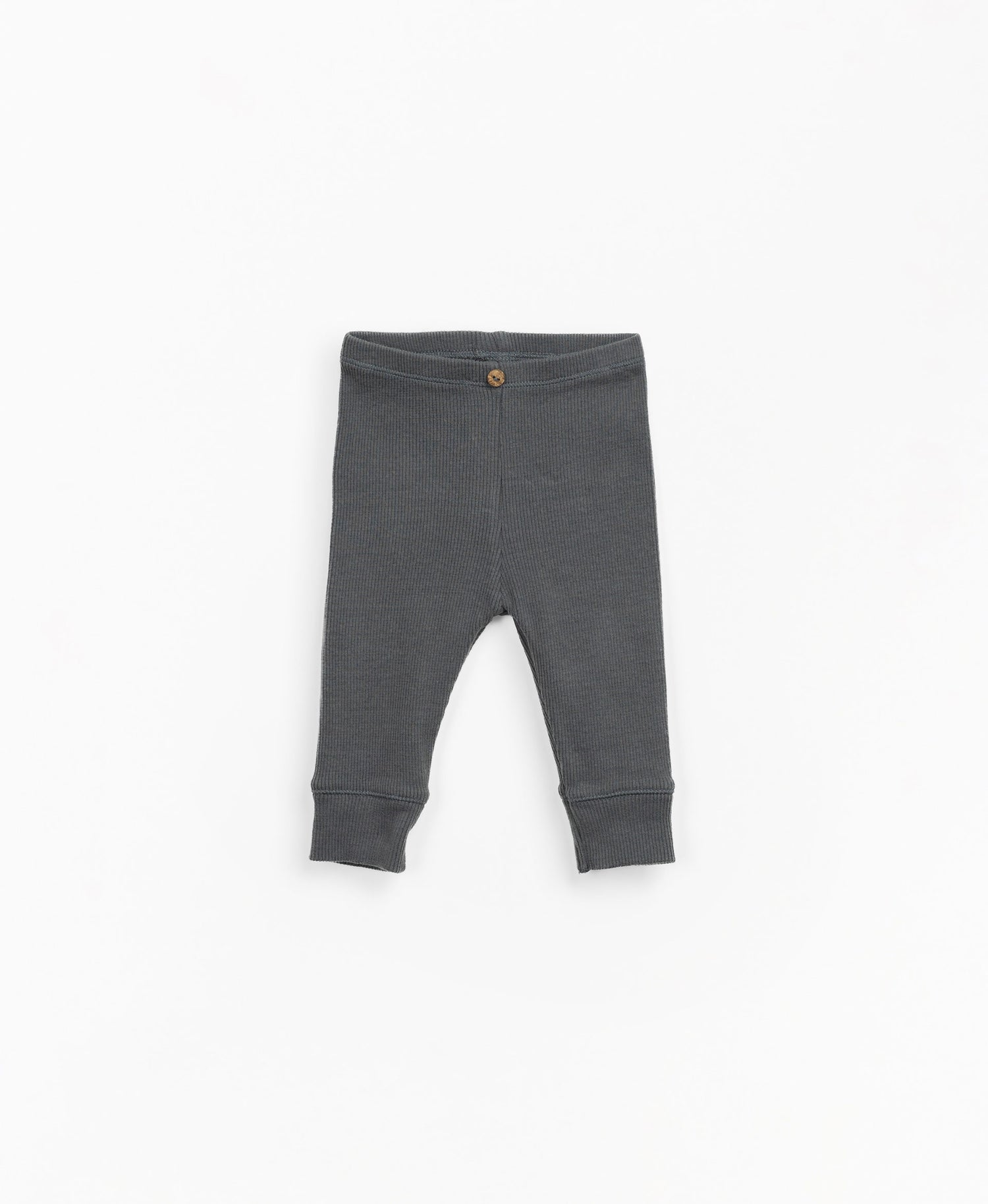 These ribbed leggings are made of jersey stitch organic cotton, César colour. The model has an elastic waist, a decorative coconut button and high hem.