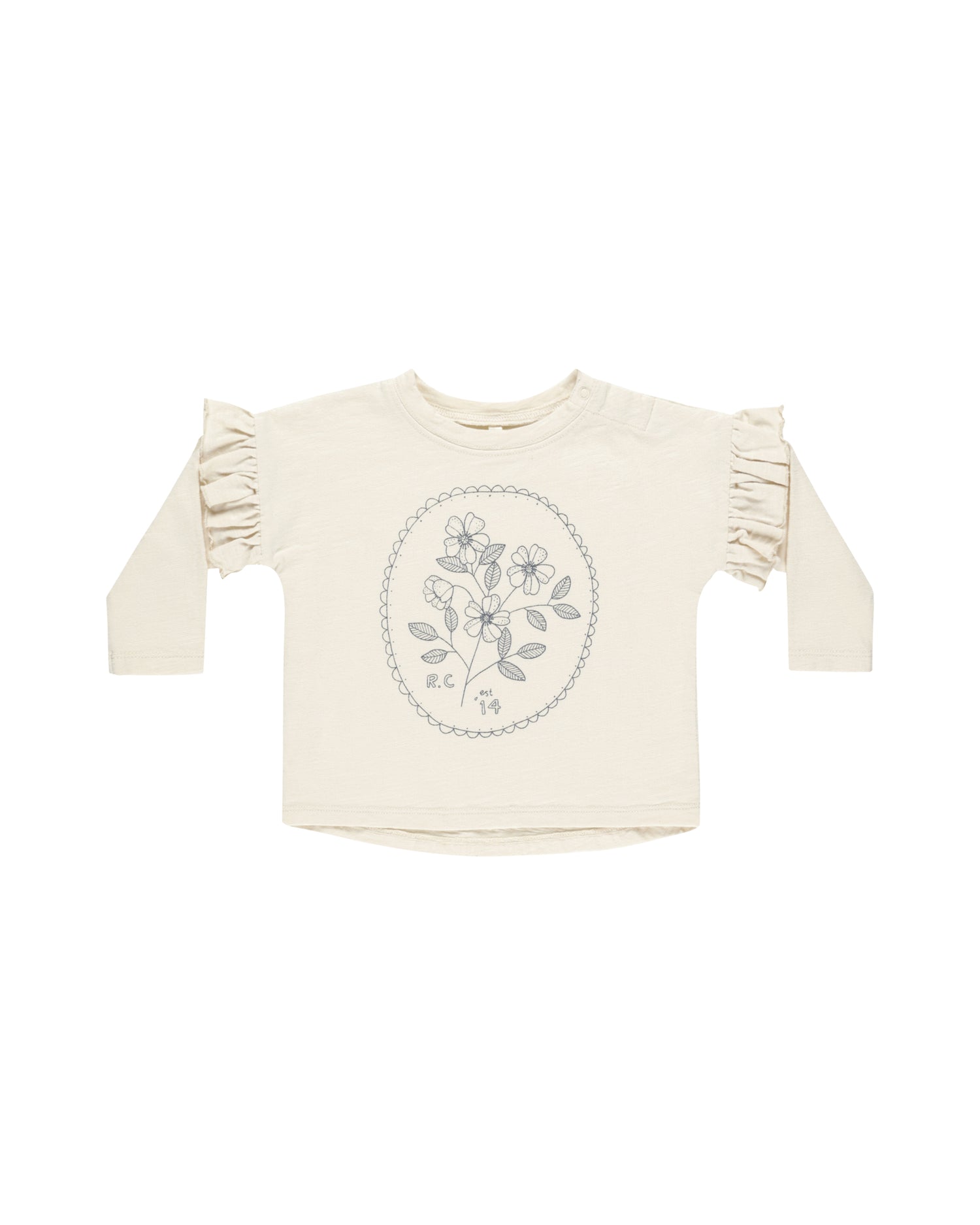 Relaxed fit long sleeve crewneck tee made from the softest cotton slub fabric. Featuring a gentle curved hemline and ruffles near the shoulder. Baby sizes 0-3m thru 18-24m have snaps at the shoulder for easy changing.