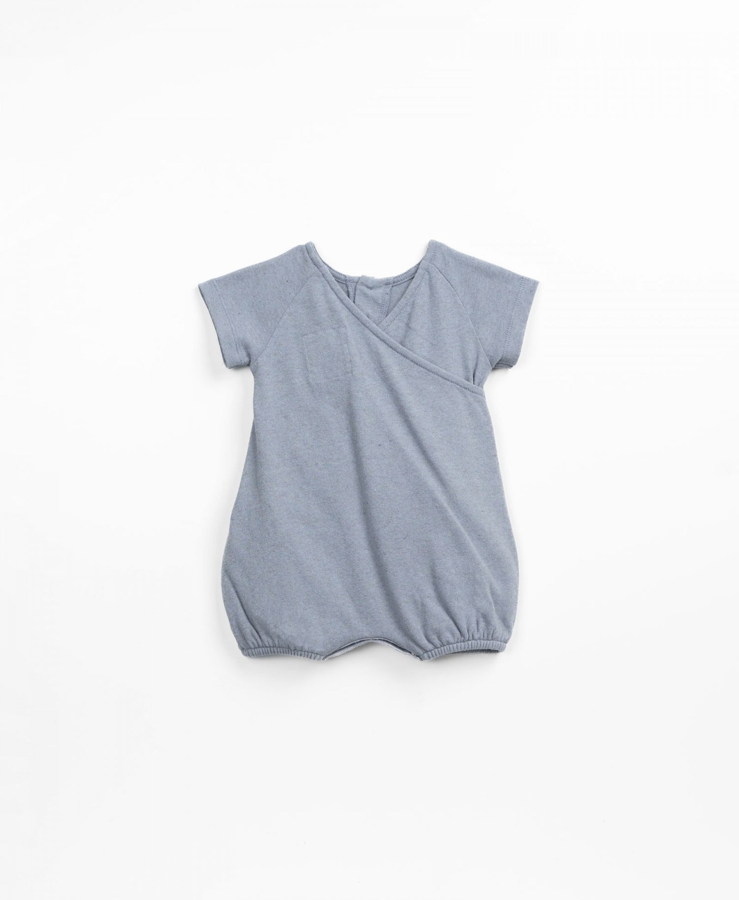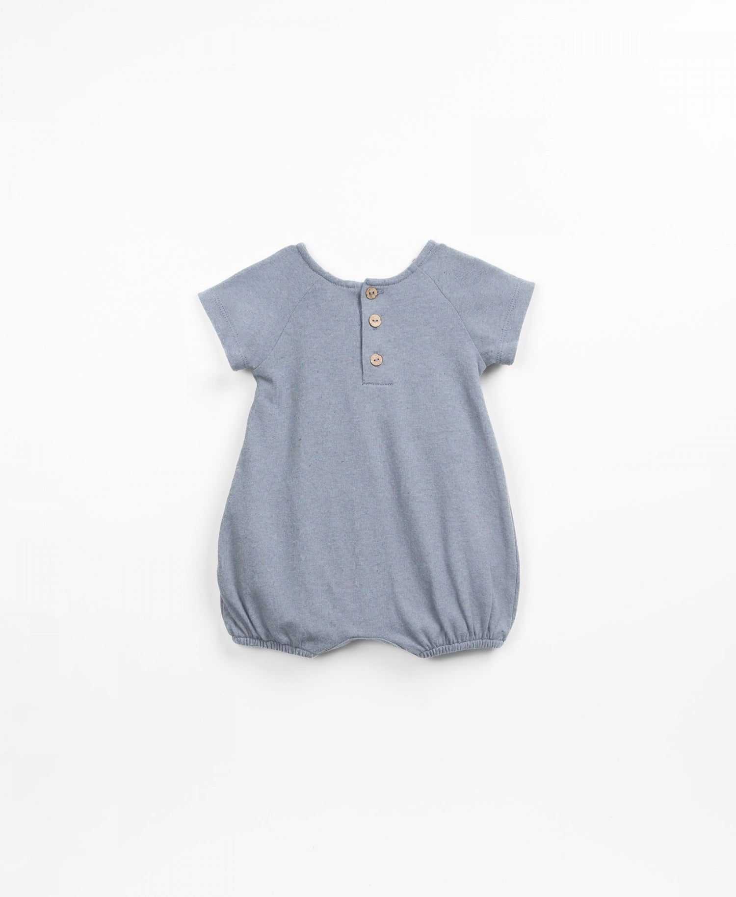 This jersey stitch jumpsuit is made of recycled fibres, Crochet colour. Its composition contains 15% of our recycled Re(Play) yarn. Using the natural colour of the yarn, we significantly reduce water, chemical and energy consumption. This baggy model has short sleeves, a round neck, crossed detail on the back and an opening on the front with coconut buttons and a crotch opening with nickel-free metal spring