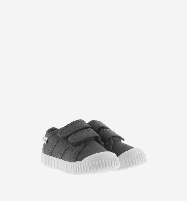 Kids' shoes made in Spain in high quality eco-friendly cotton canvas. Fastened with two adhesive straps to encourage their autonomy. Label with the multicolour logo on the side. They include an inner insole for greater comfort and are very easy to wash. Sole with reinforced toecap for greater resistance and durability.