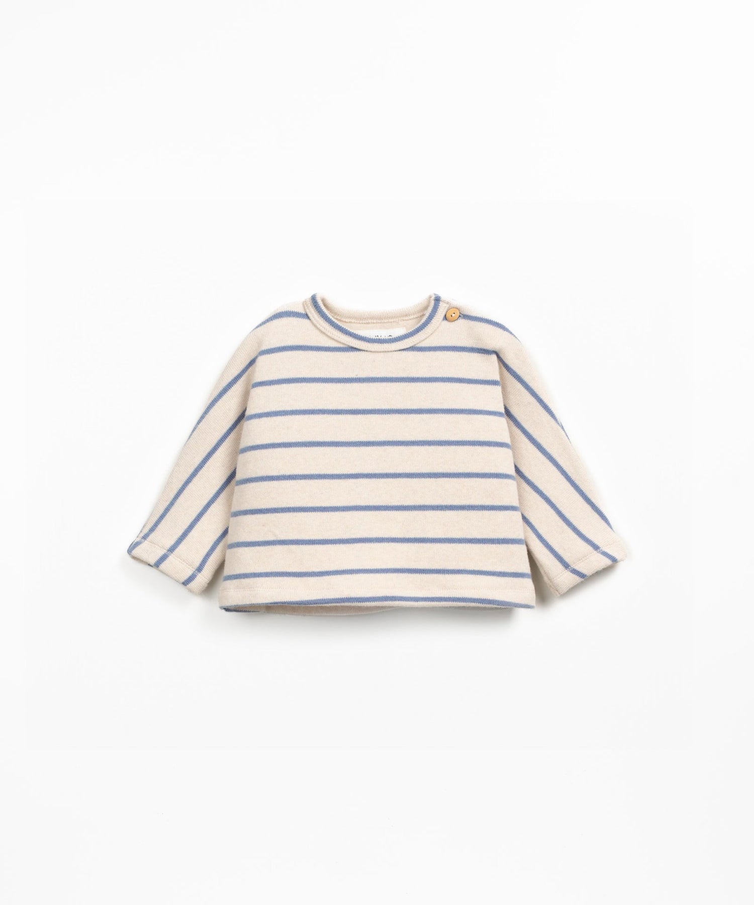 This sweater is made of knit fabric with a blend of regenerative cotton and recycled cotton, in Blue color. It is a long-sleeved model, with brushed interior, round neckline, shoulder opening with coconut button, and our striped pattern.