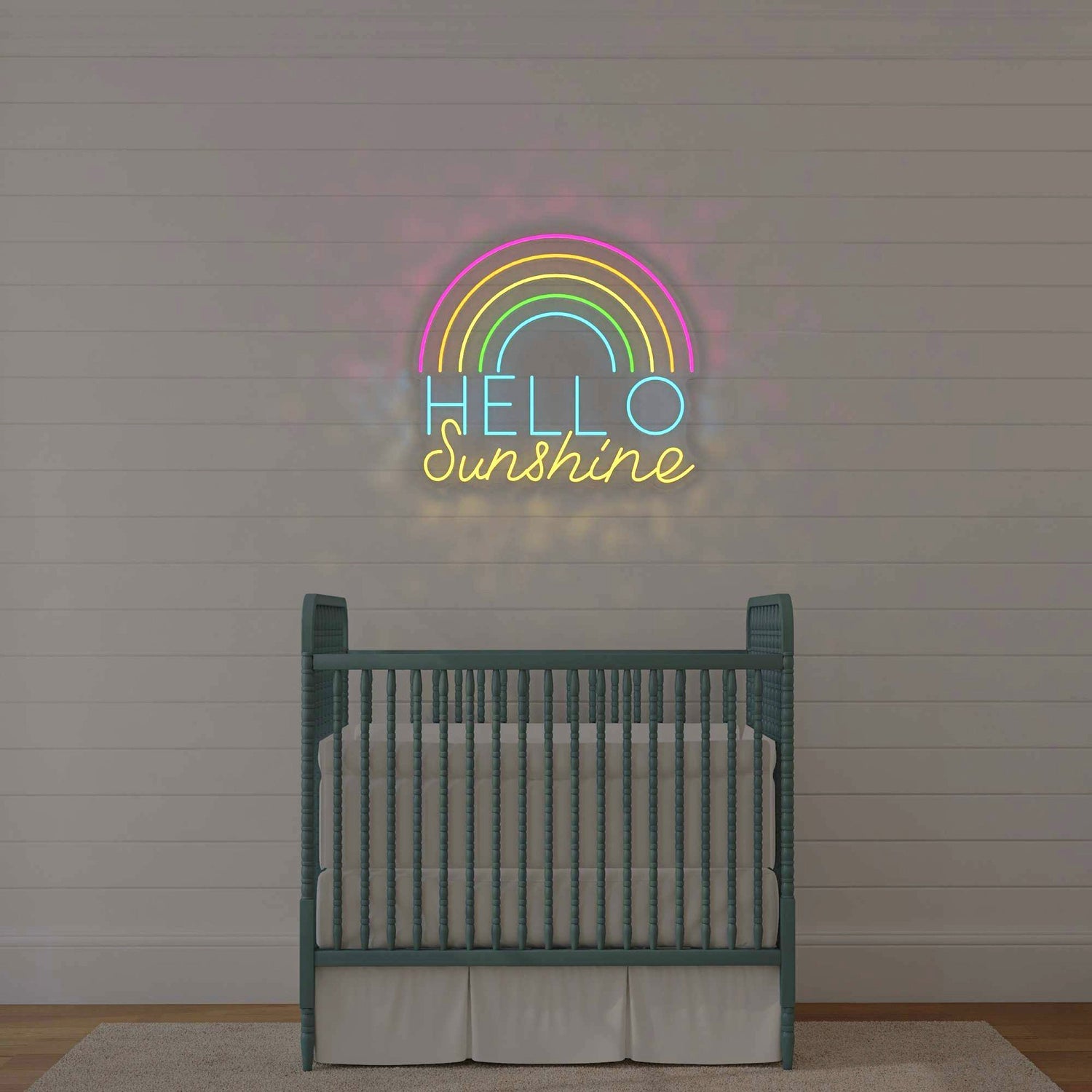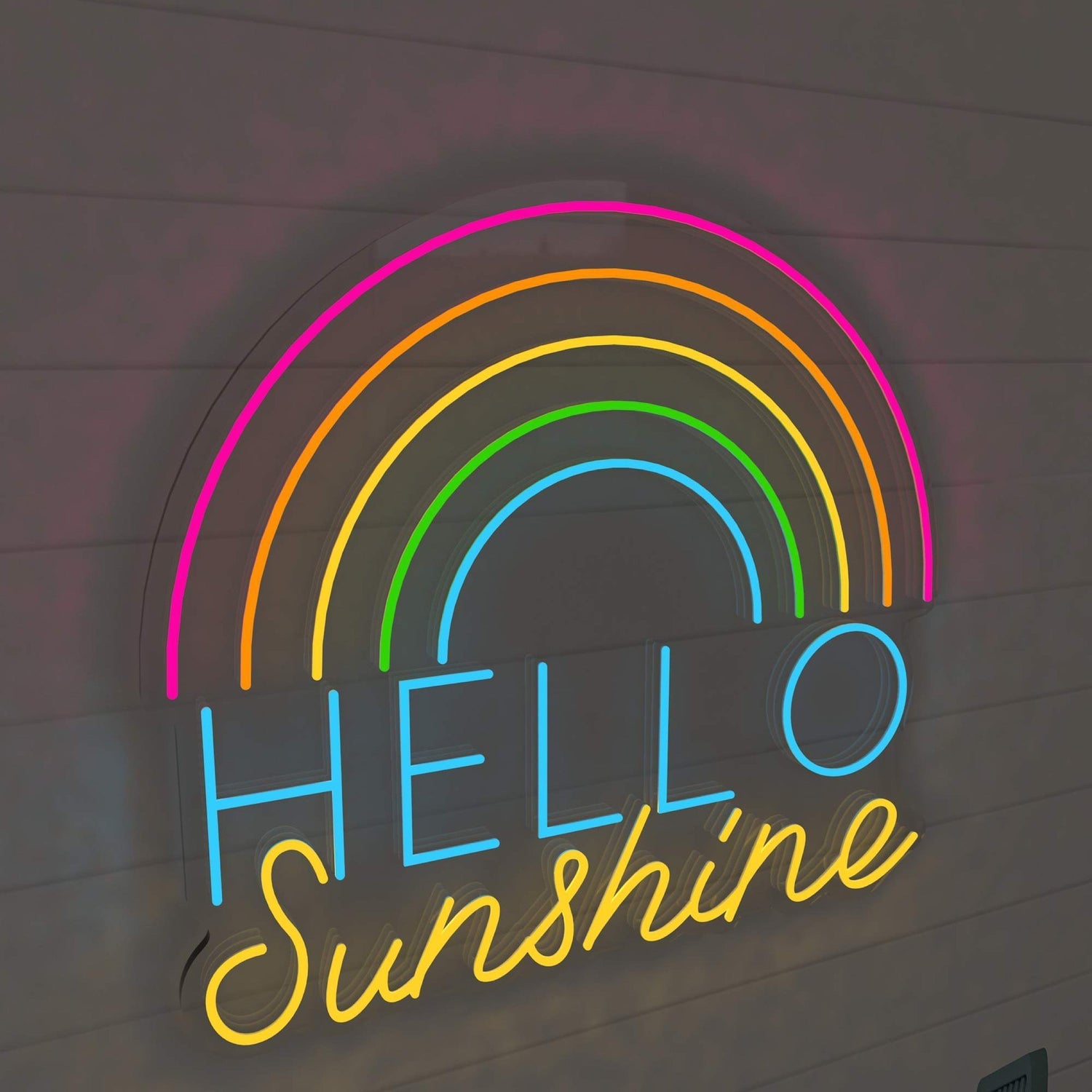 Hello sunshine! Light up your space with this playful rainbow neon sign and welcome in the light and love of life!