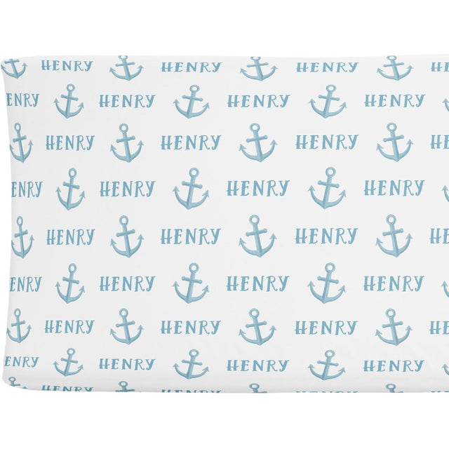 Sugar + Maple Personalized Changing Pad Cover | Anchor - Stretch Jersey / Blue is backordered and will ship as soon as it is back in stock.