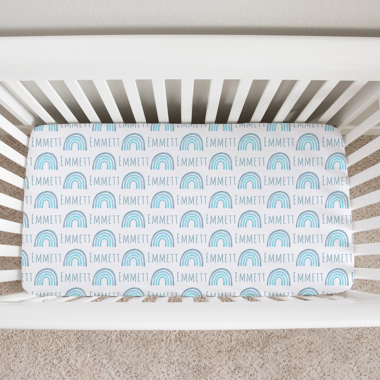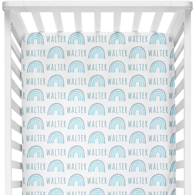 Sugar + Maple Personalized Crib Sheet | Rainbow - Stretch Jersey / Blue / Vertical is backordered and will ship as soon as it is back in stock.