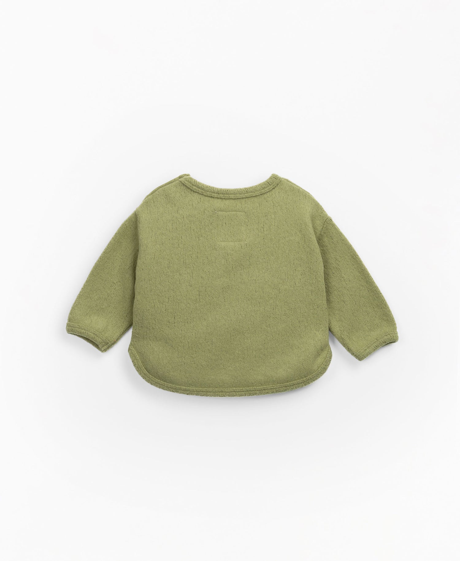 This jersey-stitch sweater is made of a mixture of recycled polyester and recycled cotton, Elsa colour. The model has a round neck and fleece on the inside, an opening on the shoulder with coconut buttons and a front pocket.