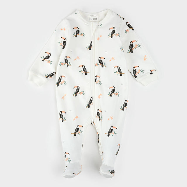 Toucan Print on Off White Sleeper by Petit Lem - NB is backordered and will ship as soon as it is back in stock.