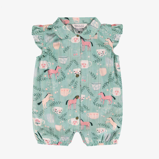 Turquoise romper in shimmering poplin with horse all over print by Souris Mini - 6/9M is backordered and will ship as soon as it is back in stock.