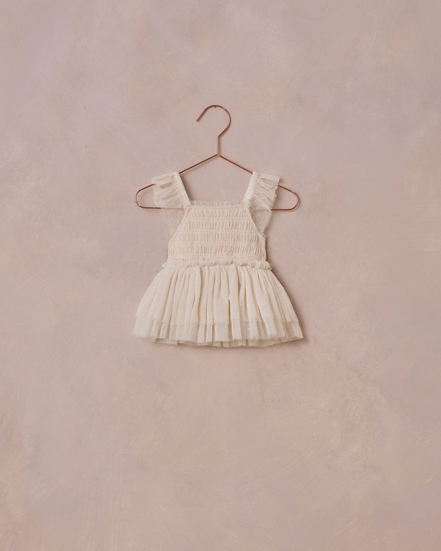 Flutter sleeves, a smocked bodice, and tiered layers, make this sweet tulle style ready to twirl.