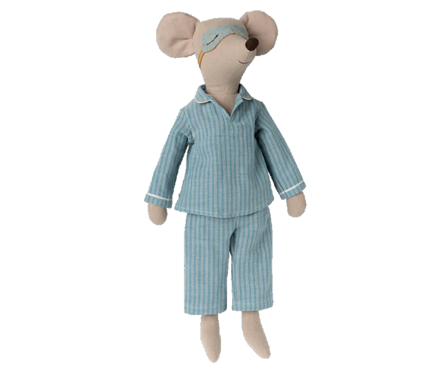 Maxi Mouse in Pyjamas wears a sleepy blue two-piece pajama set with off-white stripes. He loves that he has matching jammies with our Medium Mouse in Pajamas! He likes to sleep in his mint mask with sleepy eyes stitched on, for extra relaxing rest. Maxi mouse makes a comforting rest-time companion, and loves to cuddle.