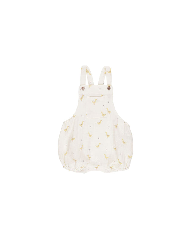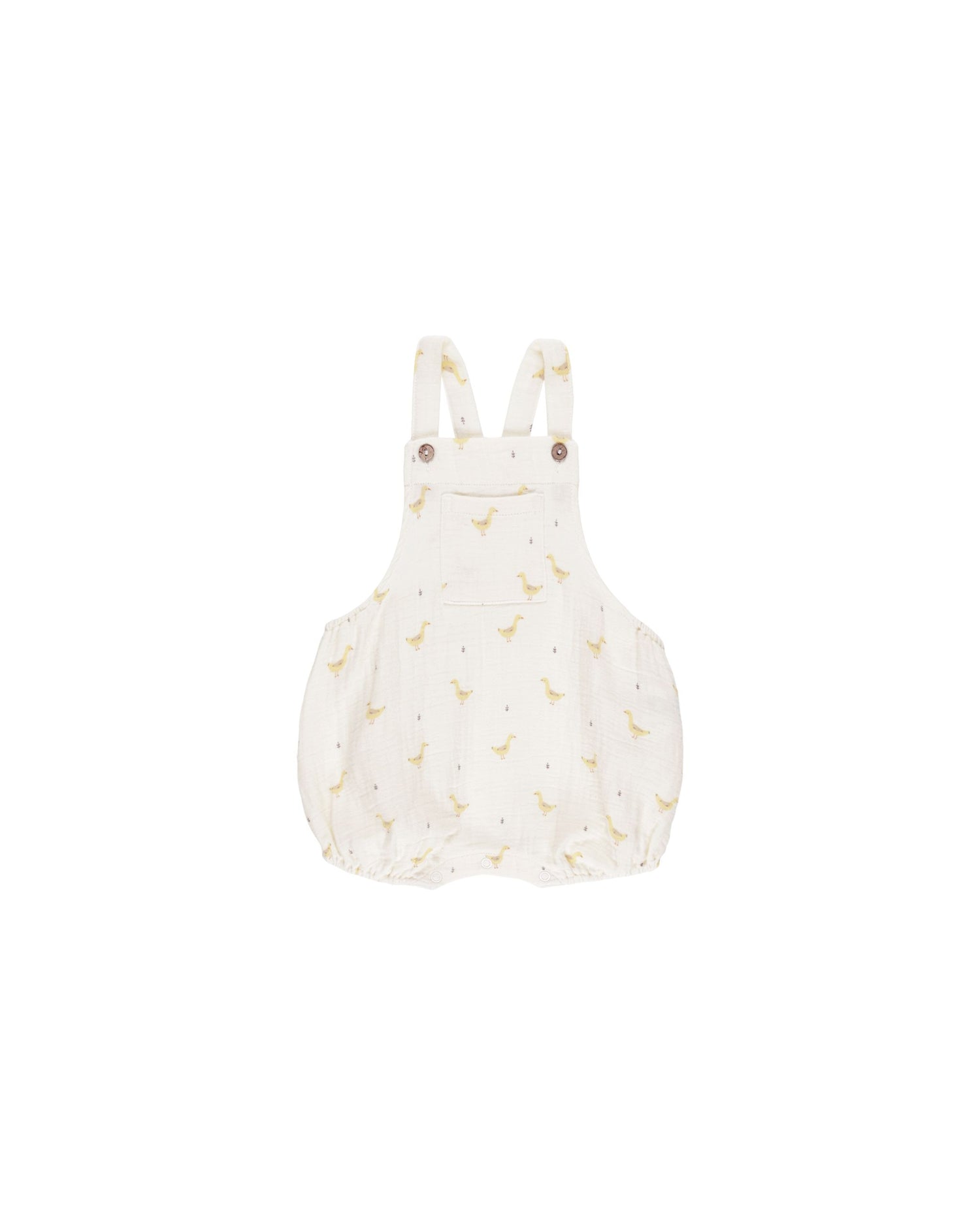 Woven overall romper featuring buttoned straps, an open bib pocket, and elastic leg openings.