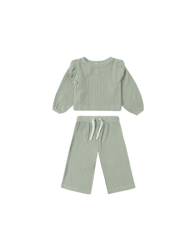 Made for cozy days, this darling set in our fuzzy waffle knit includes a long sleeve top with ruffle shoulder detail and wide leg pants featuring an elastic waistband and fixed cotton drawstring.