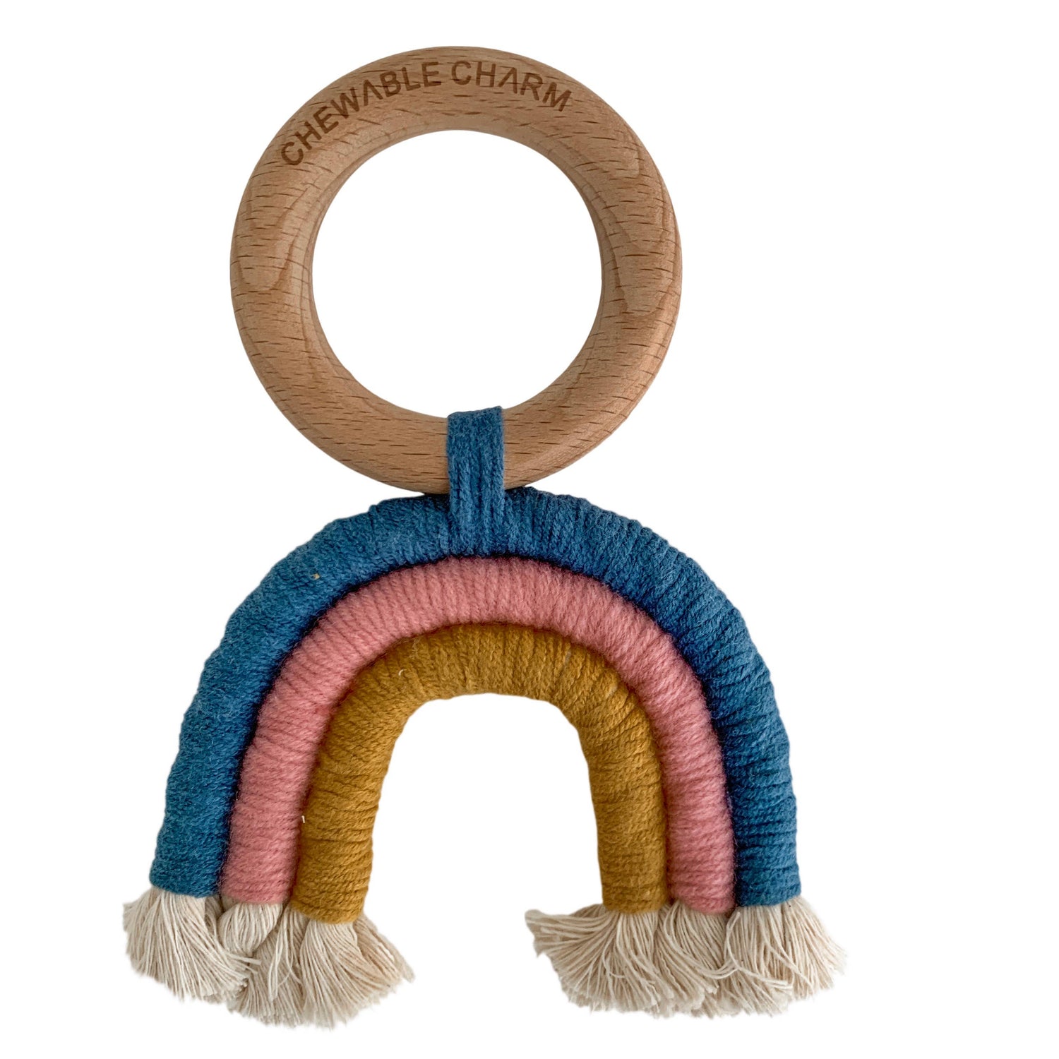 Rainbow Macrame Teether in Teal and Rose by Chewable Charm is backordered and will ship as soon as it is back in stock.