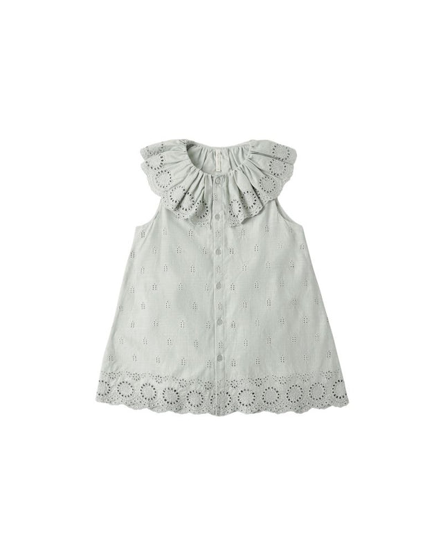 Our Marina Dress features a charming oversized collar with merrowed scalloped edges and a front button placket for a sweet finish.