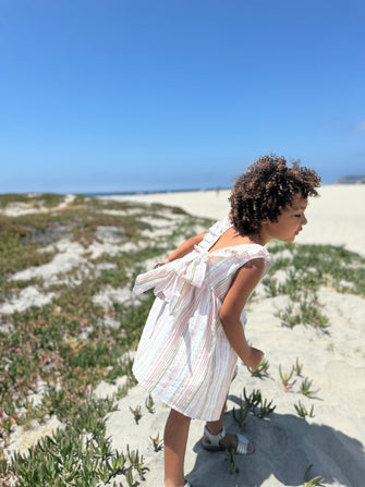 The Jewel dress is a true showstopper with its beautiful pink stripes and elegant ruffled V-back. Featuring a charming bow tie closure in the back for an added wow factor. This dress is both sophisticated and playful. Perfect for special occasions or sunlit adventures, the Jewel dress is designed to make every moment feel extraordinary.
