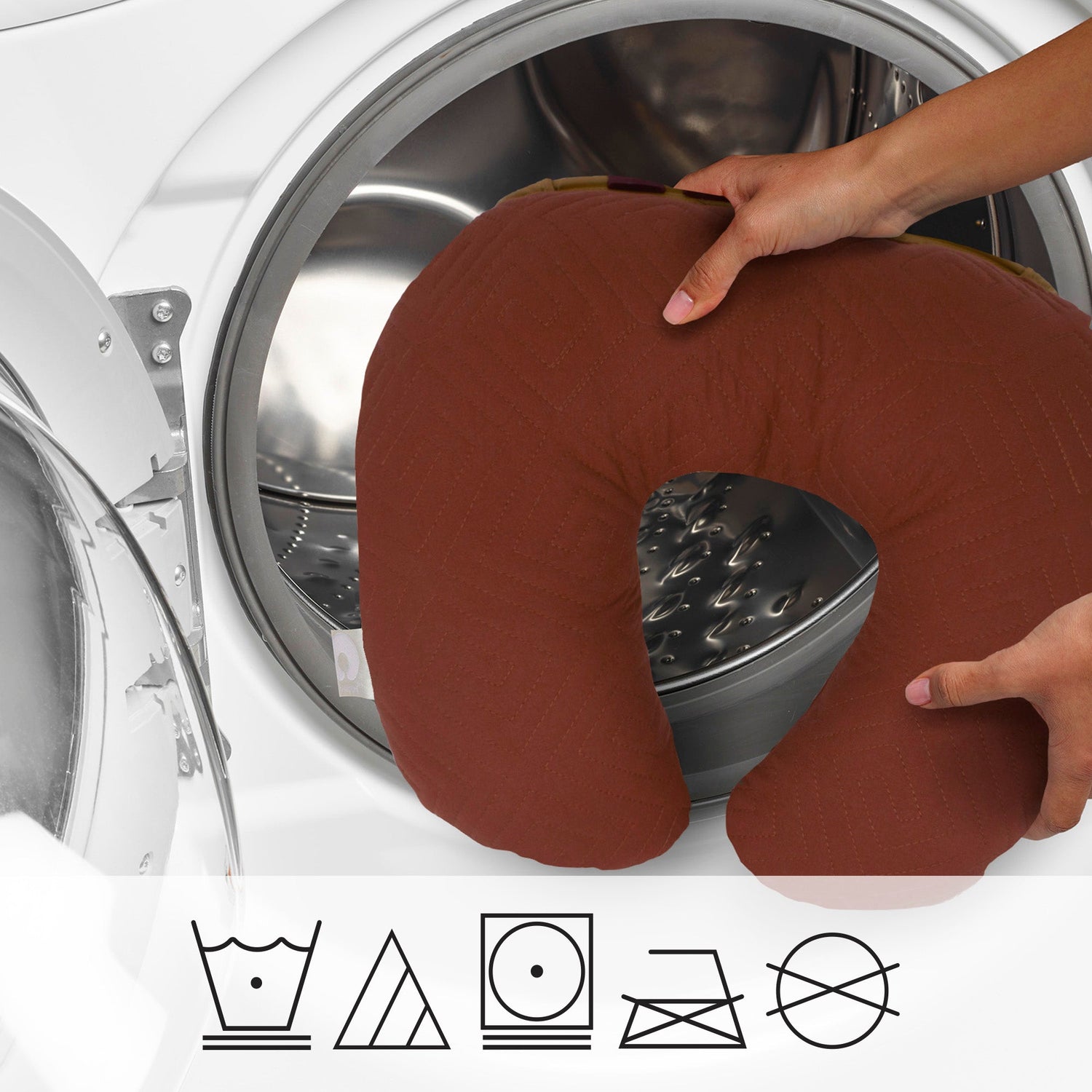 Pillow: Machine wash, delicate cycle, 30ºC/85ºF. Non-chlorine bleach as needed. Tumble dry low on delicate cycle. While drying pillow, throw a sneaker or tennis ball (wrapped in a pillow case) in the dryer to help the pillow keep its shape. Do not iron. Do not dry clean.