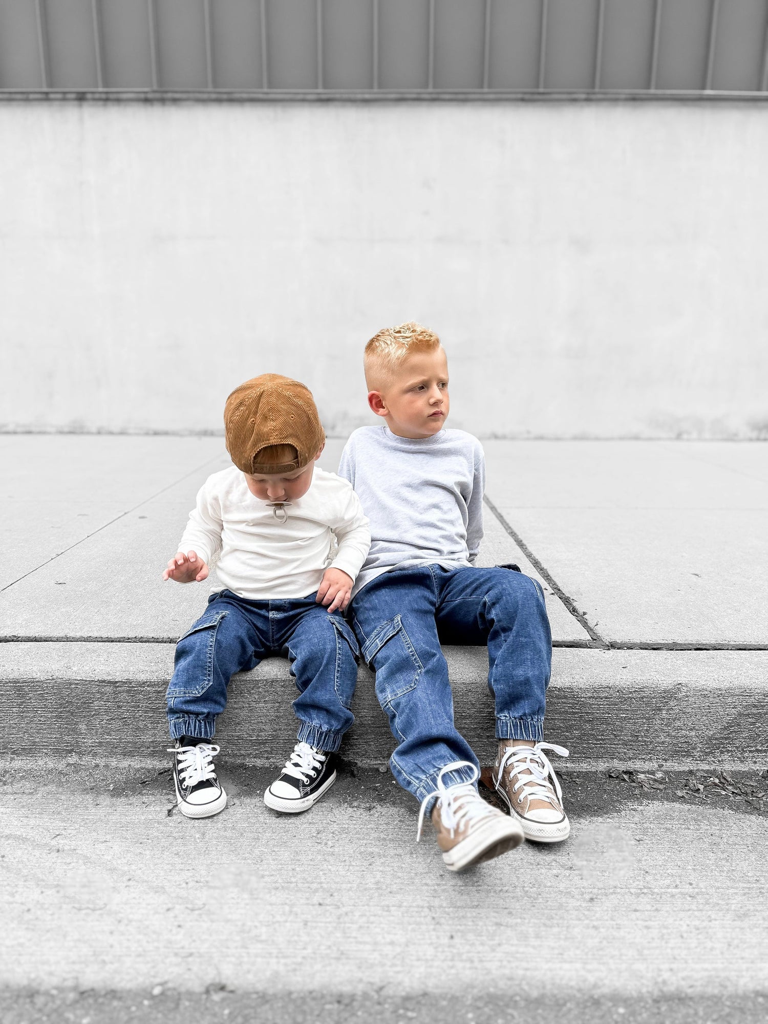 The Cargo Denim Jogger combines comfort with a touch of rugged style. Available in Black Wash and Classic Denim Wash, these joggers feature practical cargo pockets for all their little adventures. Crafted from durable denim with a soft elastic waistband, these joggers ensure both style and mobility for active days.