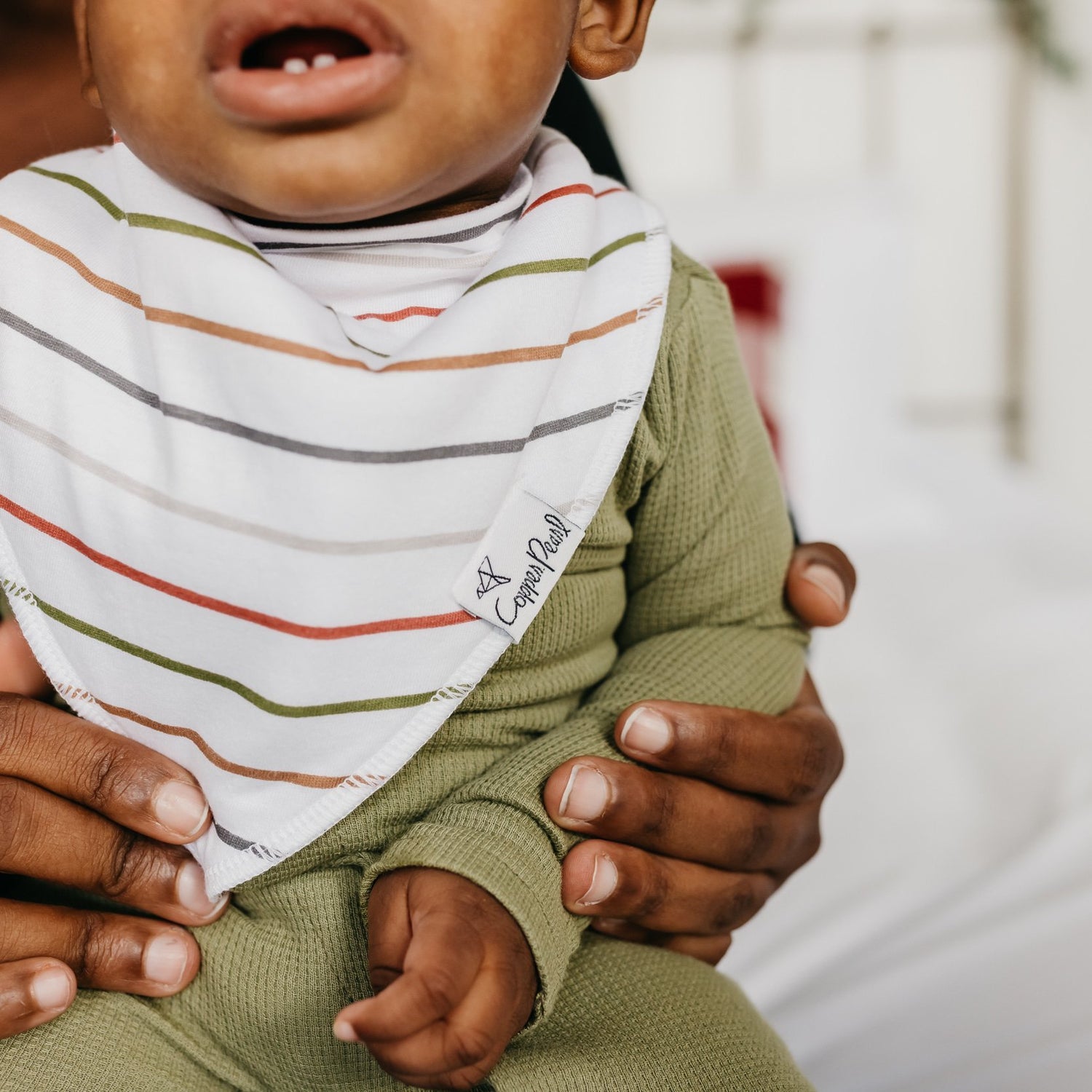 These stylish drool bibs are made of 100% absorbent cotton on the front and 100% polyester fleece on the back. The front of the baby bib is a stylish knit fabric and the back is a super soft fleece that keeps your baby completely dry even with the drooliest of babies. Great for teething babies!