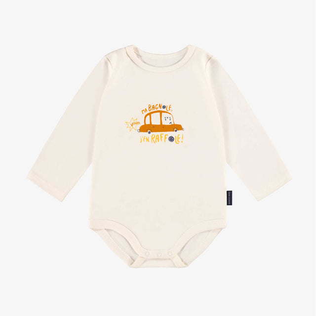 Cream-colored, long-sleeved bodysuit featuring an illustration of a car with the adorable words: ma bagnole, j'en raffole. Made of soft stretch jersey.