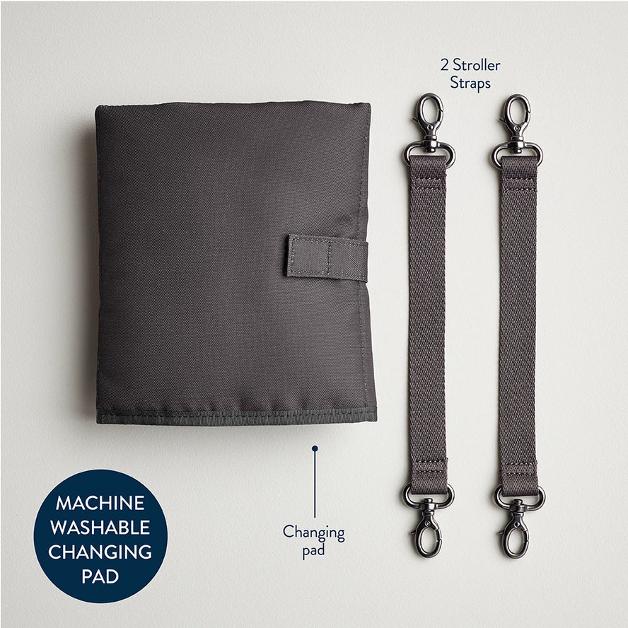 Say Hello to our NEW Era - this sleek silhouette is complete with 15 pockets, slip on luggage sleeve, and matching accessories included (changing pad and stroller straps). Features: - 8 internal and 7 external including 2 large insulated bottle pockets - Coordinating machine-washable padded changing pad included with hook and loop closure - Includes coordinating stroller straps to free your hands when you are on-the-go -Zippered trolley cart sleeve doubles as a pocket when not in use. -Four metal feet protect bag bottom from dirty surfaces and wear and tear