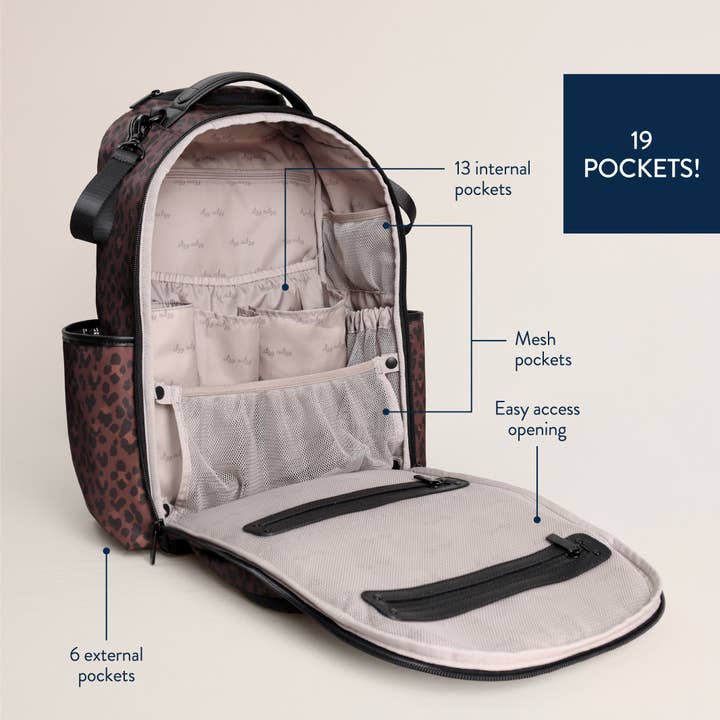 Your plus one for baby & beyond! Elevated with thoughtful organization and on-trend styling, the Boss Plus™ Itzy Rity Diaper Bag Backpack is designed for your parenthood journey – from welcoming baby at the hospital to daily errands + excursions to an amazing work, pumping or all-in-one for you bag. Want the grand tour? This bag is a travel fan-fave for first class fun as an airplane carry-on or a car seat tag-along. Bonus! With 19 total pockets (!!!) – this is our largest capacity diaper bag yet with must-have features including: insulated side bottle pockets, comfy shoulder straps, a roomy main compartment, felt-lined valuables pocket and our signature rubber bottom feet and top-to-bottom zippers for total functionality and durability. Ready to say yes to the Plus? Your new fave diaper bag is waiting to meet you every (little) step along the way! Features - Removable vegan leather accent tassel - Tons of interior and exterior pockets, 19 total pockets (13 internal and 6 external including 2 large insulated bottle pockets) and a unique, easy access front mom pocket with 3 interior pockets and key lanyard. Laptop pocket – fits up to a 15” laptop. Zippered tall front external pocket - Coordinating easy wipe changing pad included with whimsical "head" and "toes" printed on the inside. - Itzy Ritzy Logo and Braid Rubber Foot design - Includes coordinating stroller straps