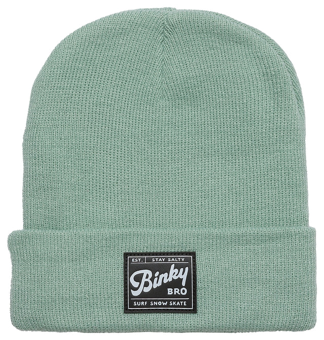 Our Seafoam Park City beanie is 100% acrylic. It has a "BinkyBro Surf Snow Skate" embossed patch on the front. Sizes are currently available in newborn, infant, toddler, youth, and adult.