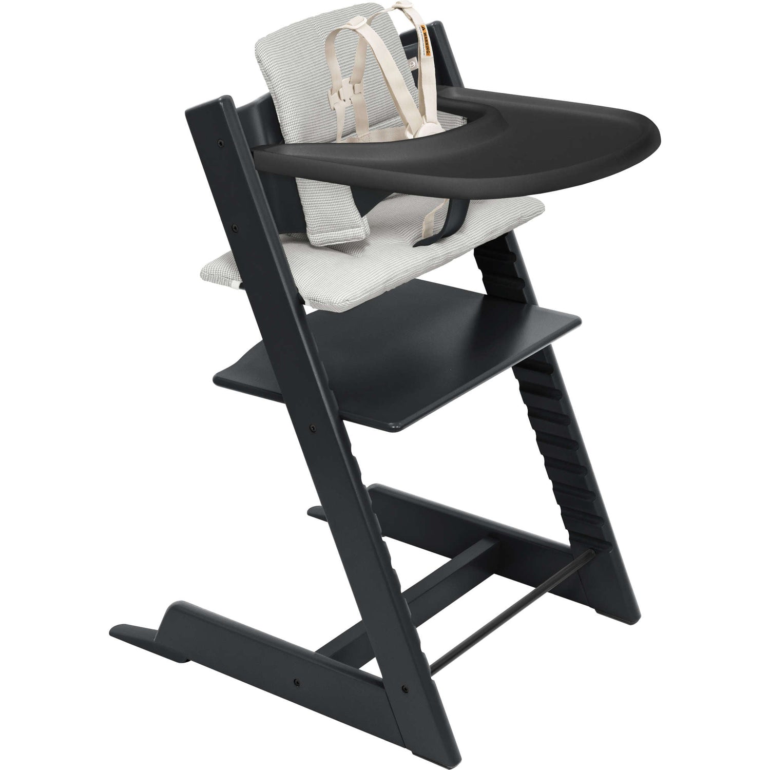 Convenient all-in-one highchair bundle that includes the Tripp Trapp chair, Tripp Trapp Baby Set², cushion, and Stokke tray. This configuration suits the needs of your child from 6 months to 3 years. Tripp Trapp Baby Set² has a new, easy, intuitive harness buckle, 2 click-in points, and a quick, one-click release button.