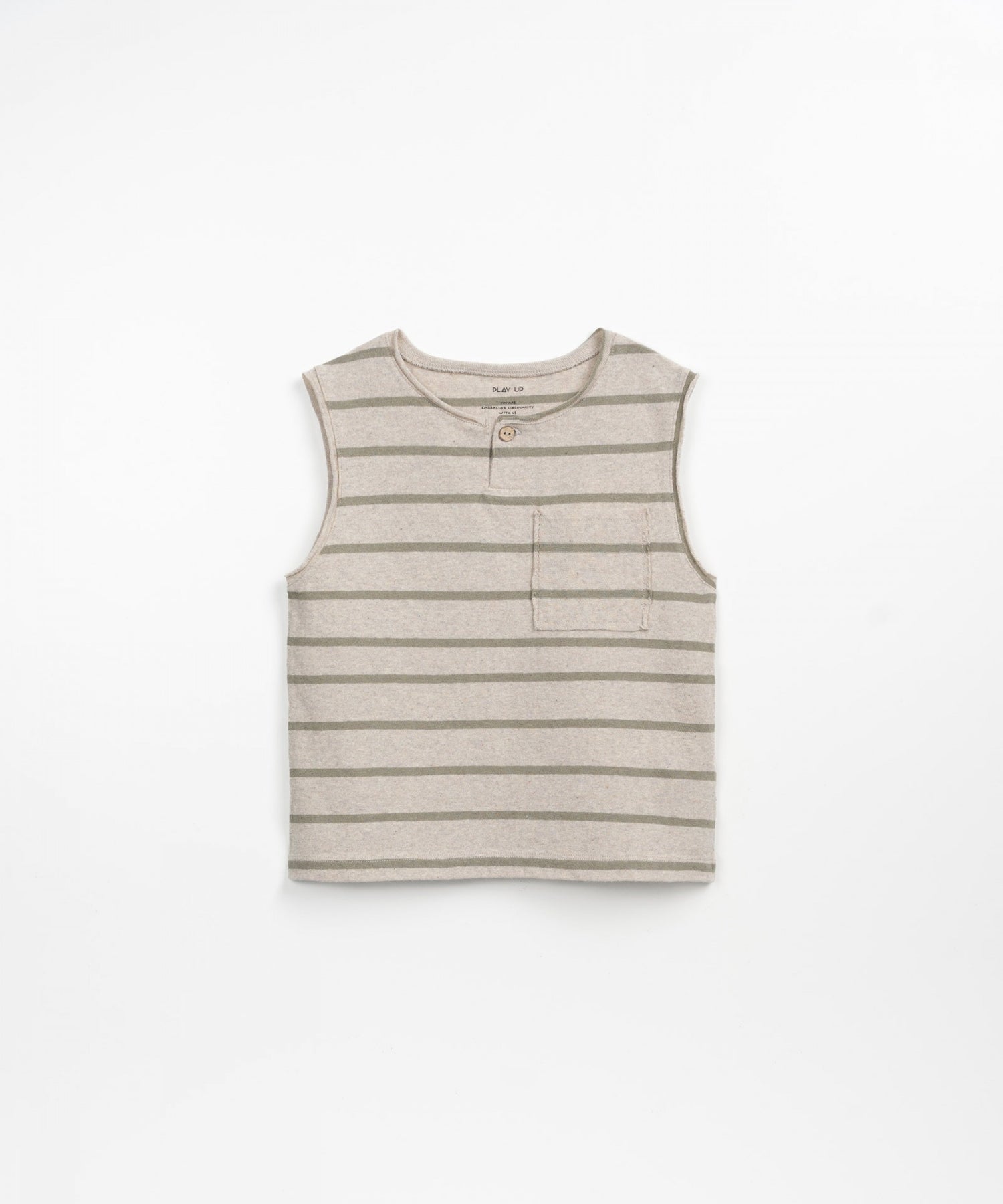 This jersey-stitch T-shirt is made of a mixture of recycled fibres. Its composition contains 15% of our recycled Re(Play) yarn. Using the natural colour of the yarn, we significantly reduce water, chemical and energy consumption. The sleeveless model has round neck, a front opening with a coconut button, a breast pocket and fine stripes.