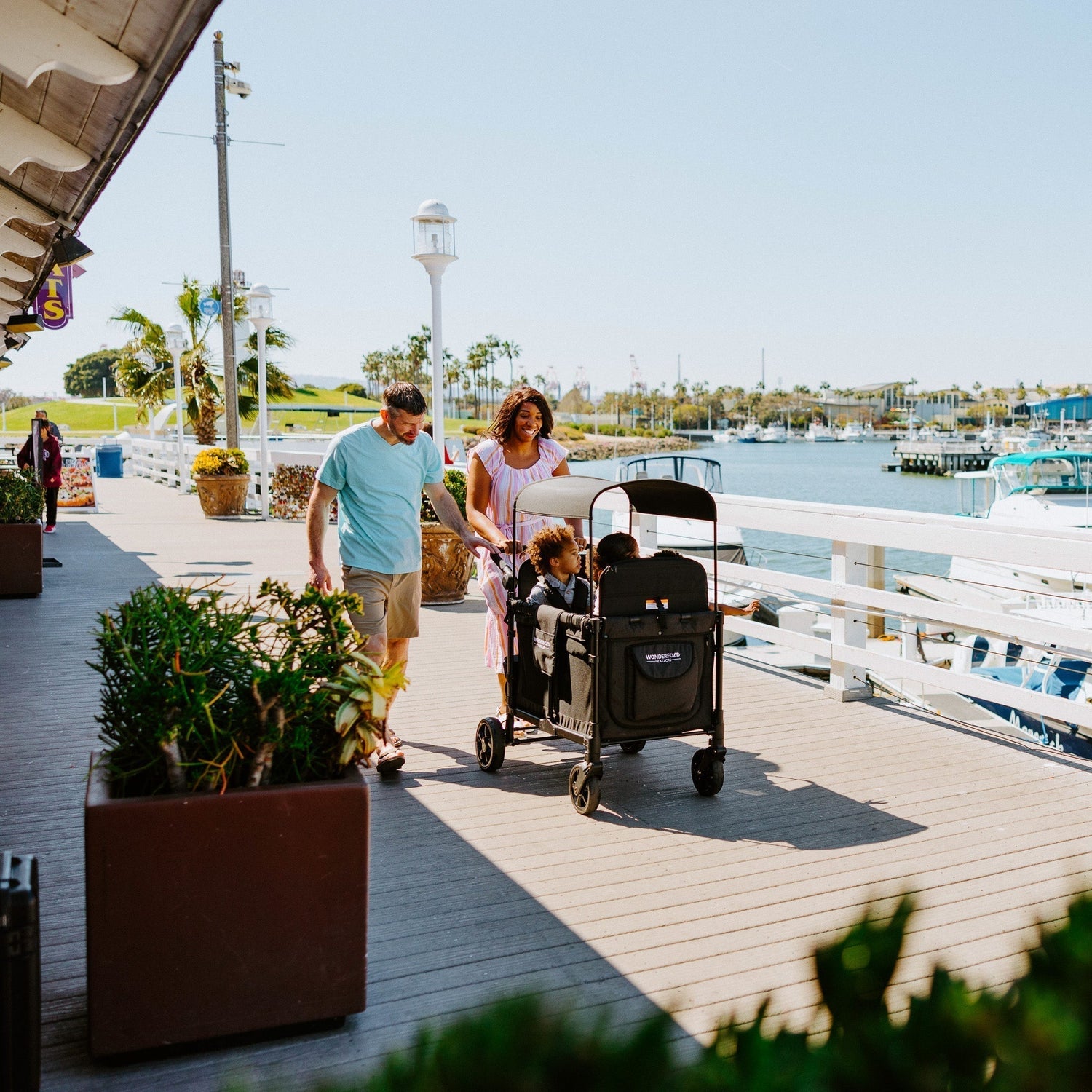 Venture out effortlessly with the W4 Elite Pro Stroller Wagon. It features elevated, reclining seats for a better view, spacious seating for up to four, a lightweight aluminum frame, safety features, and sun protection. Versatile seating can face forward or backward, with removable frames and front-zippered entrances for easy access. With WonderFold, focus on creating lasting memories, not just managing logistics.